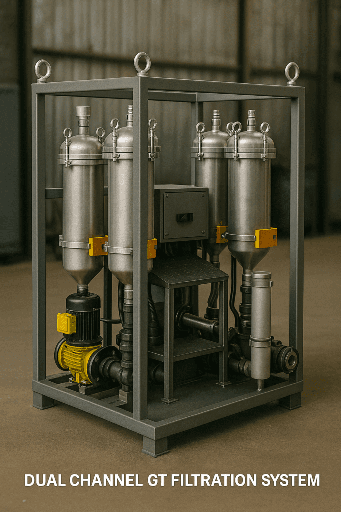 Ensuring the filtration skid is sized correctly for the application, we utilise high-quality pumps and a technically advanced multi-stage filtration system with a pre-filter, 3-micron, and then coalescer filtration units. We circulate your fuel through our GT filtration skids. These units can be portable or a fixed design for long-term use.